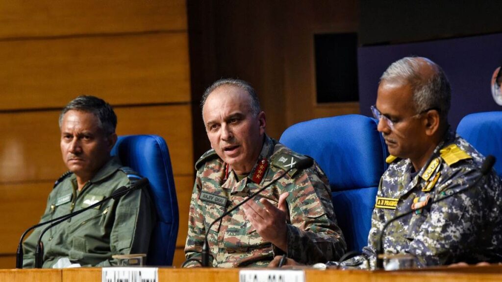भारतीय सेना, वायुसेना और नौसेना की एक अहम प्रेस कॉन्फ्रेंस रविवार को आयोजित की गई। इस कॉन्फ्रेंस में ऑपरेशन सिंदूर को लेकर विस्तार से जानकारी दी गई। डायरेक्टर जनरल ऑफ मिलिट्री ऑपरेशंस (DGMO) लेफ्टिनेंट जनरल राजीव घई ने ऑपरेशन की पूरी जानकारी साझा की। उनके साथ एयर मार्शल अवधेश कुमार भारती (डीजी एयर ऑपरेशंस) और वाइस एडमिरल एएन प्रमोद (डीजी नेवल ऑपरेशंस) भी मौजूद थे। यह पहली बार था जब थल सेना, वायुसेना और नौसेना – तीनों सेनाओं के वरिष्ठ अधिकारी किसी ऑपरेशन को लेकर एक साथ प्रेस को जानकारी दे रहे थे। कॉन्फ्रेंस की शुरुआत शिव तांडव की संगीत धुन से हुई, जिससे माहौल और भी प्रभावशाली बन गया।